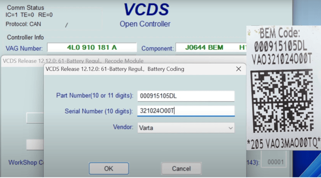The screenshots below show the registration of a battery in a BMW program (left) and VCDS (right).