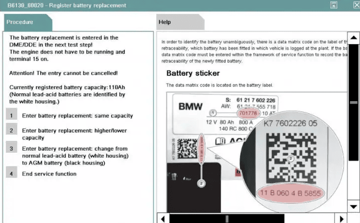 During registration, the stored values of the battery, which have deteriorated over time, are erased. Even when an identical battery of the same brand and capacity and cold cranking amperage is installed, the replacement must be registered. Of course, the data of a battery with different characteristics must be communicated. This can be done by manually entering the capacity [Ah] and cold cranking amps [A], or by filling in the part numbers or serial numbers. With modern diagnostic equipment, the QR code depicted on the battery’s sticker can be scanned.