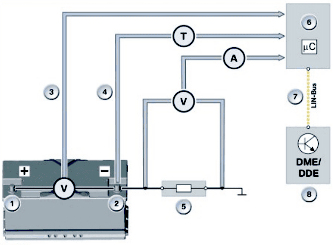 The shunt resistor is denoted by number 5. The voltage difference (V) across the shunt is read as current (A). This data is sent via the LIN bus to the DME/DDE, which are the designations for the gasoline engine (DME) and diesel engine (DDE) of BMW.