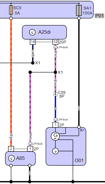 In the following diagram, we see the battery sensor (A85), which is powered by a 12-volt supply on pin 2 through a fuse. Pin 1 is for communication: from here, a message is sent via the LIN bus to the gateway (A25di) and the alternator (O01). Pins 1 and 2 are located in the two-pin connector shown in earlier images.