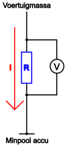 The accompanying image shows a diagram where resistor R represents the shunt and current I the discharge current during the discharging of the battery. The voltmeter, placed parallel over the shunt resistor, illustrates how the measuring electronics in the battery sensor measures the voltage difference across this shunt.