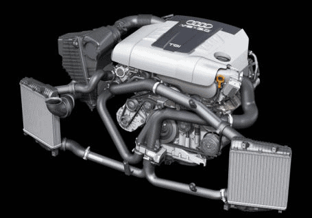 In the image, an Audi engine is depicted with two intercoolers at the front. These intercoolers are often not directly visible because they are mounted behind the grilles in the front bumper. Some cars have one smaller or a long, large intercooler.