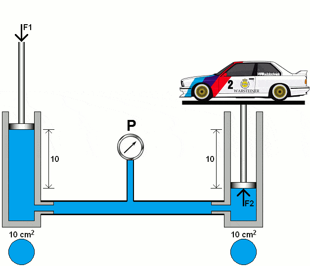 We see this principle in the following image, where a piston applies a force (F1) to the piston surface. The force creates a pressure in the (closed) fluid-filled system, which pushes the piston upward with force F2.