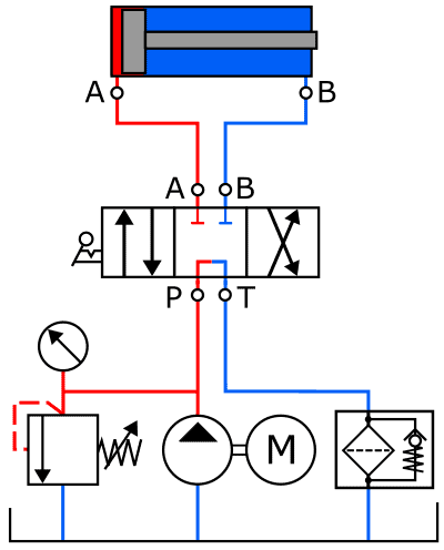 Because the hydraulic oil circulates in this position of the directional control valve, there is hardly any pressure build-up. There is only a certain degree of resistance that the oil encounters in the directional control valve, the lines, and the return filter. However, this resistance is so low that the oil is pumped around without pressure.