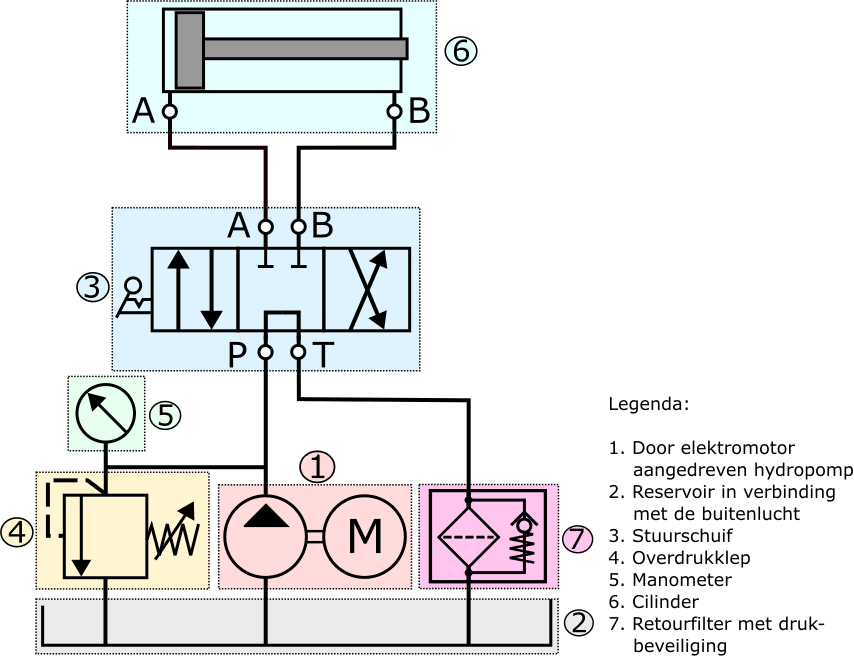 In the following image we see the most commonly used components in a hydraulic system. The components are shown with a color and number.