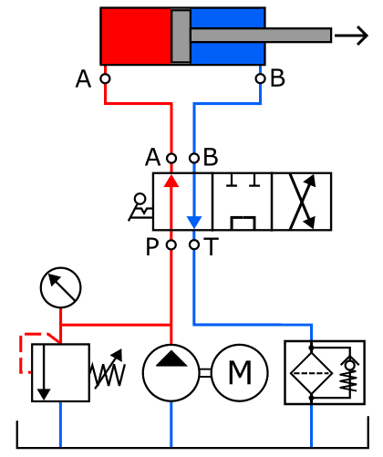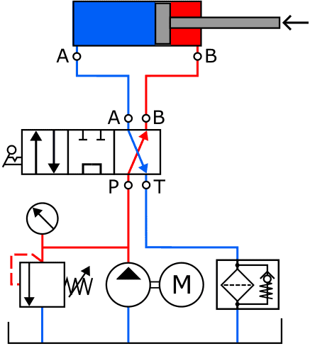 Because the return (B) of the cylinder is now connected to the T port of the directional control valve, the oil on the right side in the cylinder can flow to the reservoir – via the return filter.