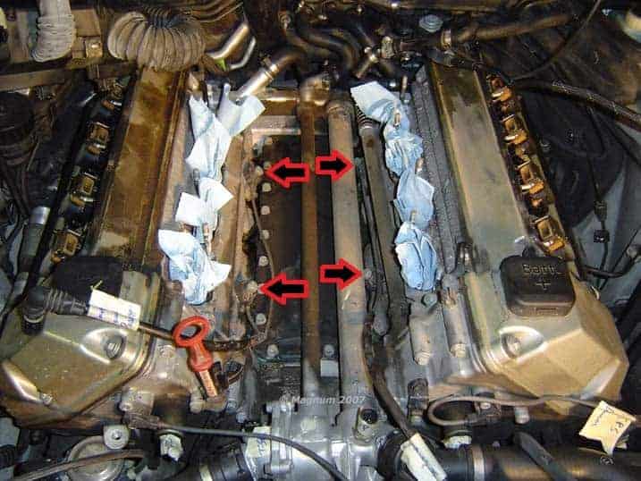 The picture below shows a V8 engine block on which 4 knock sensors are mounted. The tips of the arrows indicate the knock sensors. It’s somewhat difficult to see. The sensors are attached to the engine block with 1 small bolt. You can see the wiring of these sensors running forward.