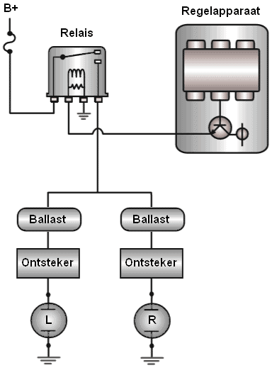 To generate and limit these high voltages, a control gear unit is used: the igniter. The igniter provides the high switch‑on voltage. The ballast (shown separately from the igniter in the illustration) is often mounted together with the igniter in one housing. The ballast controls the maximum current through the lamp. If no ballast were used, the lamp would receive too high a current and would fail.