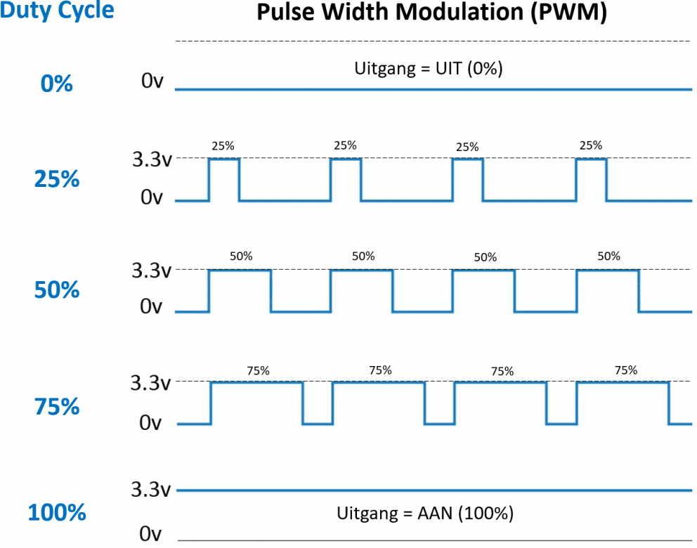 The duty cycle determines the time the LED is on. By rapidly alternating the on-off pulses between 3.3 and 0 volts, the LED lights up at a lower brightness. a