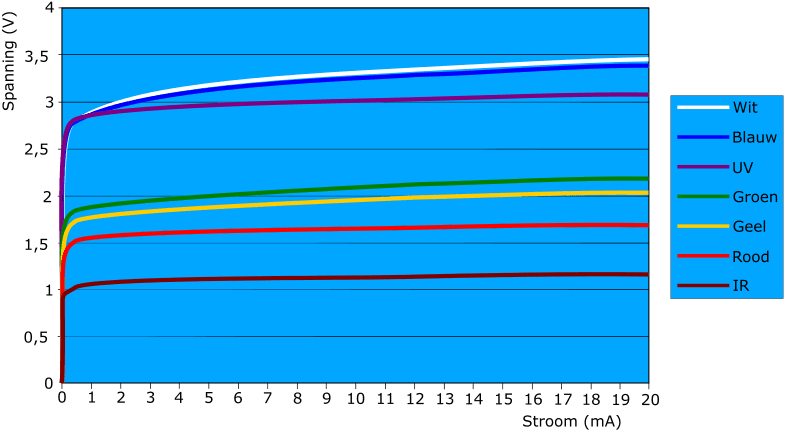 The characteristic shows the voltage built up in the depletion zone, and thus the conduction voltage of the respective color LED. When current is passed through an LED, a virtually constant voltage drop occurs. a