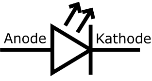 The adjacent image shows the symbol of the diode, with additional text above the “anode” and “cathode” sides. The symbol of an LED is almost identical to that of a diode, but it includes two upward-facing arrows indicating light emission. The current direction, as with the diode, is in the direction of the arrow. The vertical line represents the reverse direction. If the current flows in the arrow’s direction (left to right) through the LED, it will light up. Conversely (right to left), it will block and not light up.