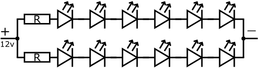 By connecting LEDs in series, no or only a low resistance series resistor is needed. The internal resistance of the LEDs themselves ensures the supply voltage is distributed over the LEDs in the series connection. The more LEDs placed in series, the smaller the series resistor can be. The image shows six LEDs connected in series and two rows parallel.