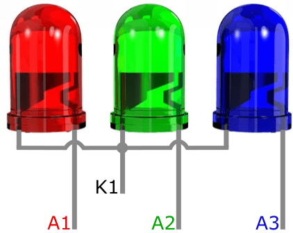 The next image shows three LEDs each with their own Anode connection (A1 to A3) and a common Cathode.
