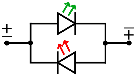 The schematic shows two parallel-connected LEDs with reversed blocking and conducting directions. Current direction determines which LED lights: green (top) or red (bottom). The polarity is reversed by an external circuit or ECU.