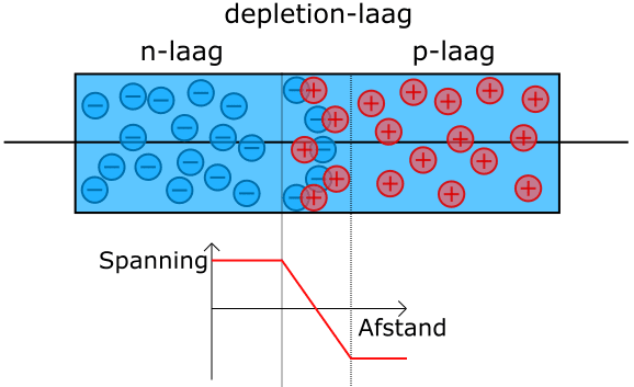 The lack of electrons in the p-layer can be seen as an excess of positive holes. In the pn-junction (depletion layer), the electron surplus in the n-layer fills the holes in the p-layer. No current flows yet, so the charge in the np-junction is neutral.