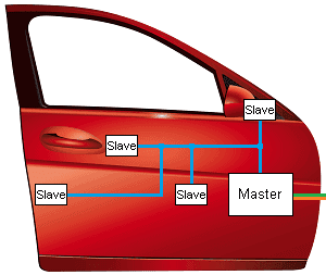 The master can be a control module or a simple switch, and the slave can be a sensor, actuator, or control module. This could, for example, be applied in the control of an AC compressor, or in the operation of a window motor. In this case, the switch is the master and the window motor is the slave.