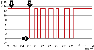 At point 1 there is a voltage of 13 volts on the bus. At point 2 the master starts sending a message. The master switches the bus to ground (point 3). Within 0.1 milliseconds the line rises back to 13 volts. While the bus is switched to ground, information transfer takes place.