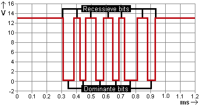 Only when the bus is switched to ground is a logical 0 formed. This is called a dominant bit. In the signal, the bus becomes dominant several times and then recessive again. The duration that the bus is dominant or recessive also varies (one horizontal line is wider than the other). By alternating these voltages, a signal consisting of ones and zeros is formed.