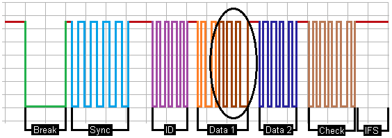 Between the different fields, the bus is recessive for a set period. This period is specified in the protocol. Then the Break field of the next message follows. The oscilloscope capture below shows a LIN-bus message from a windshield wiper motor.