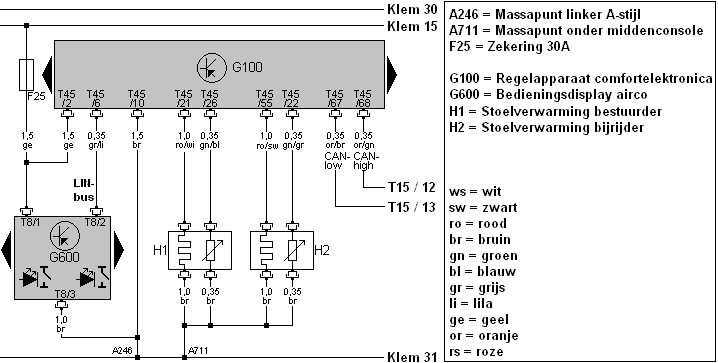 When a seat heater button on the control panel is pressed, it sends a signal via the LIN-bus to the comfort electronics control module (G100).