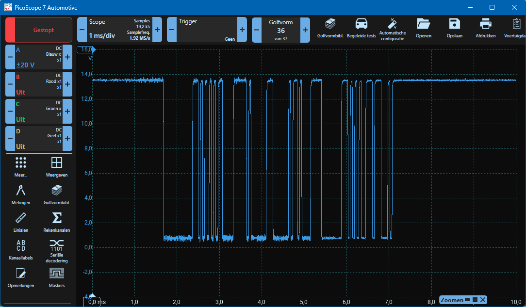The master sends a message to the slave. This information is transmitted by voltages that are either 0 volts or 12 volts. The LIN-bus signal can be measured with the oscilloscope.