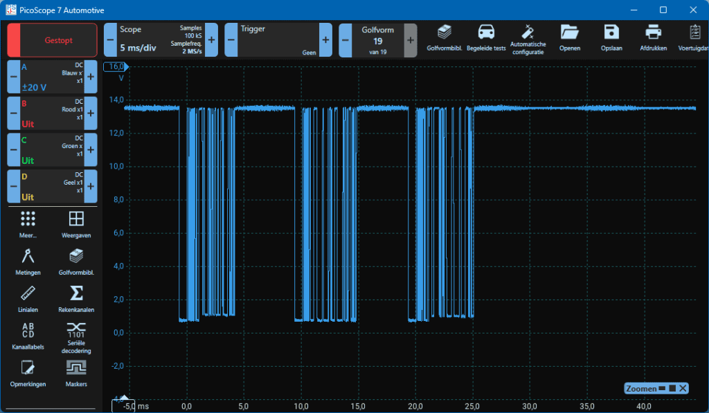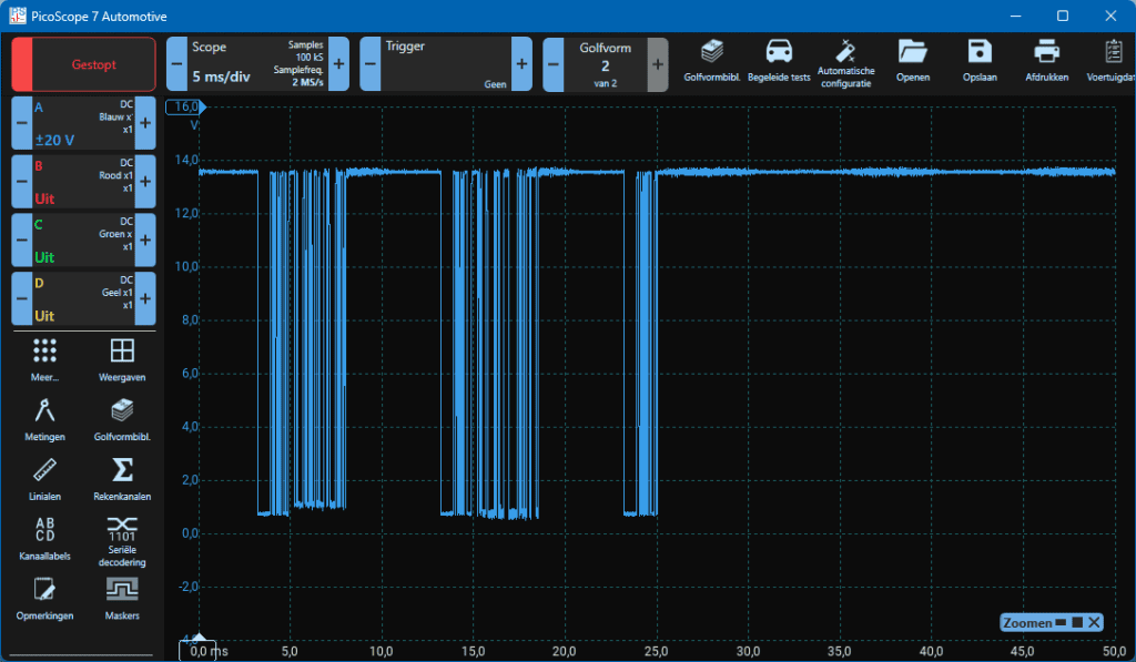 The oscilloscope capture was taken with the windshield wiper motor switched off and under conditions where no moisture was detected on the windshield. Nevertheless, there is continuous communication between the master and slaves. The ECU in the wiper motor detects a change in one or more bits in this signal, indicating that it needs to be activated.