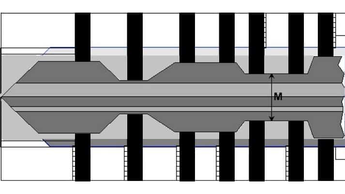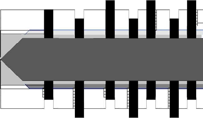 The image below shows a lock cylinder with a key blade inside. The black wafers are now positioned according to the shape of the key blade. Both the top and bottom are smooth. The wafers do not protrude from the top or bottom.