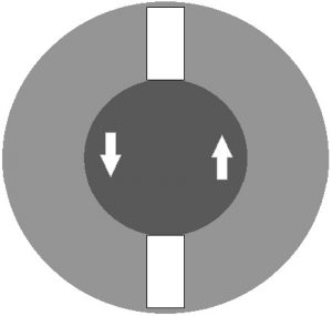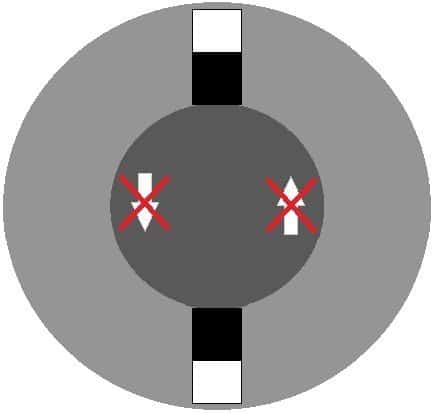 The image on the right shows the front view of the lock cylinder. The outer round section is the housing, and the darker interior part is the lock cylinder. The white sections at the top and bottom are the spaces where the wafers can sit when the key is removed, or when the wrong key is inserted into the cylinder. In this case, with the correct key (see the image above), the wafers fit within the cylinder lock. They do not protrude, so the lock cylinder can rotate within the housing.