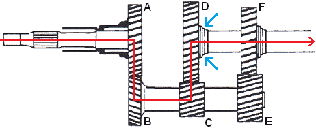 Second gear is engaged. The synchronization device is disconnected from gear D and coupled to gear F (see blue arrows). At that moment, gear D still rotates, but is not coupled to the output shaft. Gear F is, so the driving forces now go from A to B and from E to F.