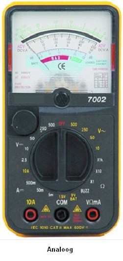 - The multimeter / analog meter: This is used to measure voltage (U), current (I), and resistance (R). The digital multimeter shows the value on the LCD display, and the analog meter indicates the measured value on an underlying scale using a needle.