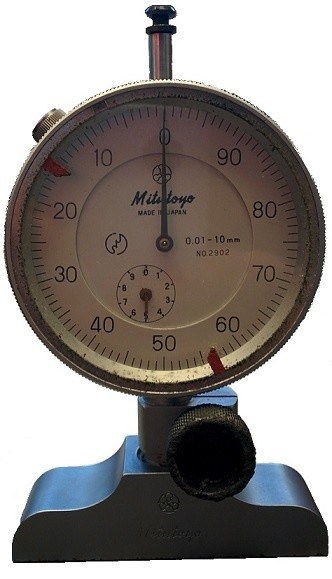 With the dial indicator, a very precise depth measurement can be performed. The small hand on the inside indicates the whole millimeters, and the large hand indicates the number after the decimal point. When the dial indicator is placed on a flat surface, it should read 0.00 mm, as seen in the image below. The outer ring can be turned to allow calibration. If 0.3 mm is read when it is on a flat surface, the outer ring should be turned so that the large hand indicates 0.
