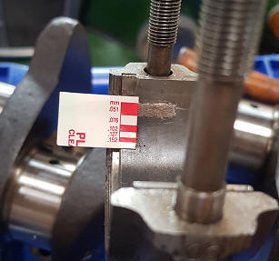 With plastigage, the clearance between plain bearings can be checked. Plastigage is a special plastic thread that must be applied to the area where the clearance is to be measured. Then, the bearing cap needs to be tightened, so the plastigage is crushed. The deformation of the plastigage is a measure of the clearance.