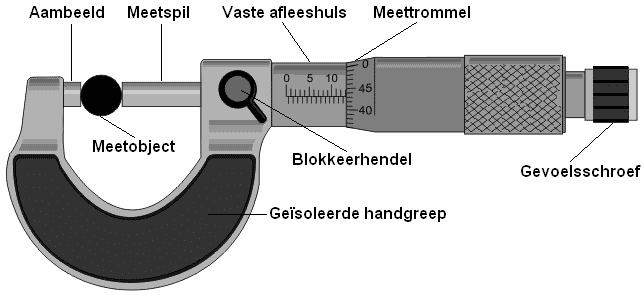 The component to be measured should be placed between the anvil and the spindle. By turning the measuring drum, the spindle moves back and forth. Before the spindle touches the component, the last distance must be adjusted with the feeler screw. The feeler screw has a click mechanism that produces a ‘clicking’ sound at a certain exerted force. When you hear this, you know you shouldn’t tighten the meter further. Over-tightening the micrometer can yield incorrect measurement results. The measuring drum can be locked with the locking lever to prevent further turning.