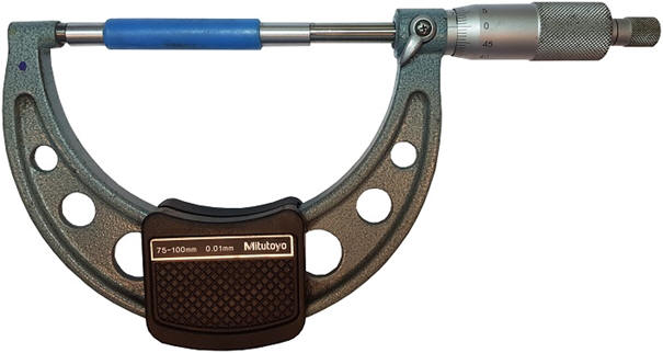 Before using the micrometer, it must first be calibrated. Incorrect calibration leads to measurement errors! The calibration of the micrometer is done with a special gauge. The gauge in the image below is exactly 75.00 mm. This means when the micrometer measures the gauge, it should indicate this exact number. If there is a wrong measurement, we must first calibrate the micrometer by turning the inner drum with the fork.