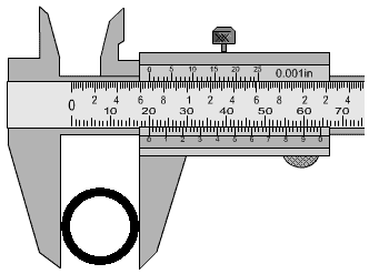 By clamping the jaws inside the ring, the inner diameter can be read. This is 18 mm. That means the ring is (20-18) = 2 mm thick.