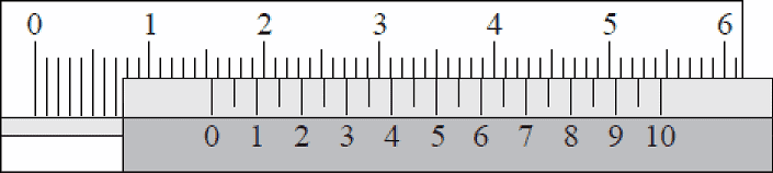 There are also small lines between the numbers on the vernier. These indicate the five hundredths of a millimeter. The line between 0 and 1 on the vernier aligns with the line on the ruler. In the image, (10 + 0.05) = 10.05 mm is measured. Reading a five hundredth requires a trained eye.