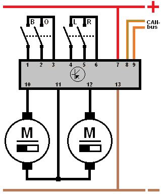 When the motor for vertical adjustment rotates, the motor for horizontal adjustment must remain stationary. Both connections of the motor that must remain stationary are shorted to ground or positive on pin 9. On pins 8, 9, and 10, a power supply or ground can be switched independently.