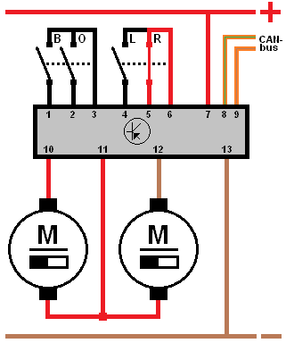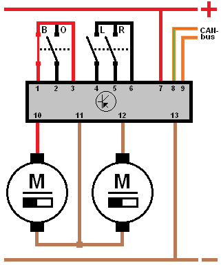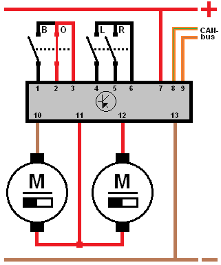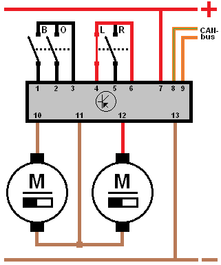 The electric motors are connected to pins 8 and 10. The left motor (pin 8) is for the vertical movements. The right motor (pin 10) is for the horizontal movements. On pin 9 is a wire connected to both motors. Depending on the situation, the ECU can switch either a positive or ground here. How this works is described in the following paragraphs.