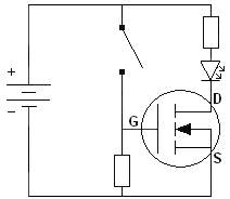 The diagram features a battery, switch, LED, and MOSFET. When the switch is closed, a voltage is applied to the gate, creating conduction between the drain and source, allowing current to flow. Because current flows through the resistor and LED, the LED will illuminate.