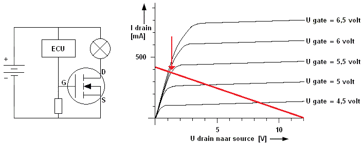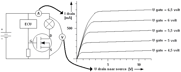 If the transistor conducts because the ECU supplies the gate with a supply voltage, a current will flow, and the lamp will illuminate. The voltage measured with the voltmeter in this situation amounts to 12 volts. The 5 Watt lamp allows a current of 0.42 Amperes (420 mA) through the drain.