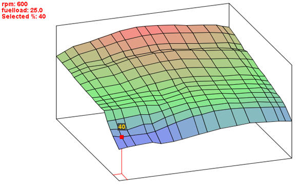 The next image shows a map in which the basic injection time is determined from the crankshaft speed relative to the vacuum in the intake manifold, which is a measure of engine load. The temperatures and oxygen sensor form a correction factor and each have their own map.