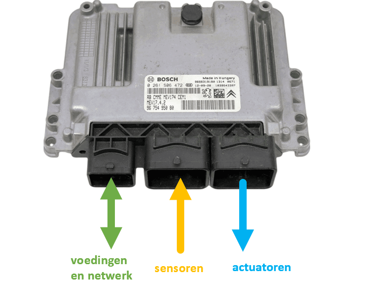 The following image shows an ECU with three plug connections. From left to right: power and network, sensors, actuators.