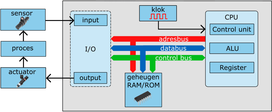 The system bus makes connections between the components in the ECU (see the image below). At the top of the ECU, we find the clock. This so-called oscillator provides a square wave frequency of usually 16 MHz. The clock frequency determines the speed of the control unit. The components in a control loop are synchronized by this timer.