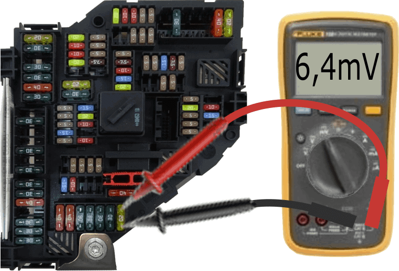 A fuse has internal resistance. With no current, the voltage drop is 0 mV. Current flow causes a voltage drop. The image below shows a 20 A fuse’s voltage drop measurement.
