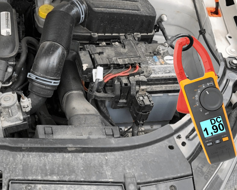 The previous section shows that the quiescent current is too high. The battery discharges because an electrical component remains on. Check the fuse box for the fuse protecting this component from excessive current. The 1.90 A current passes through one of the fuses in the fuse box.