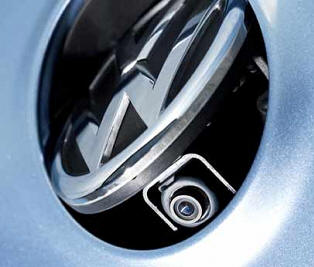 The backup camera is sometimes visible, often located near the license plate and/or the handle to open the tailgate. Manufacturers sometimes choose to mount the camera out of sight. The image below shows the backup camera of a VW Golf, where an electric motor tilts the VW emblem to move the camera outward. The emblem automatically retracts when driving forward again. Not only is the camera placed out of sight, but the lens also gets dirty less quickly.
