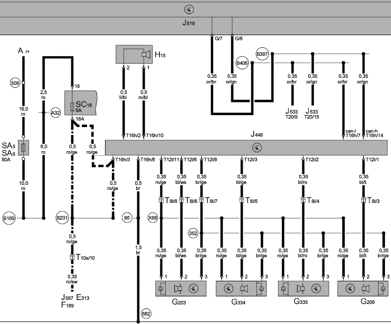 The circuit diagram below (VAG) shows the communication between the control units, inputs from switches, and outputs to, among others, the buzzer.