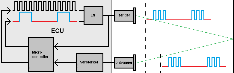 The image below shows the PDC control unit (ECU). Inside this gray square are the microcontroller, amplifier, and an AND-gate. The microcontroller sends a block voltage with a frequency of approximately 40 kHz (black). Additionally, a block voltage with a low frequency is periodically sent out (red/blue). The AND-gate receives the two block voltages. When both voltages are high, the output voltage (to the right of the AND-gate) is high. When one of the two voltages is low, the output is also low. The output voltage is returned to the microcontroller and sent to the transmitter in the PDC sensor. The transmitter emits the ultrasonic signal at a speed of approximately 300 m/s. When an object is nearby, the ultrasonic sound reflects and is registered by the receiver. This is referred to as “triangulation.” The receiver sends the formed block signal to the ECU. With the help of an amplifier, the block signal is strengthened for further processing by the microcontroller.