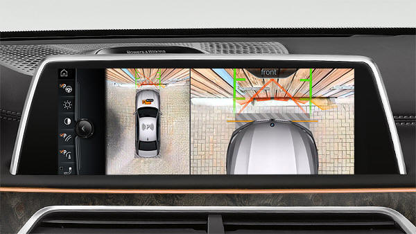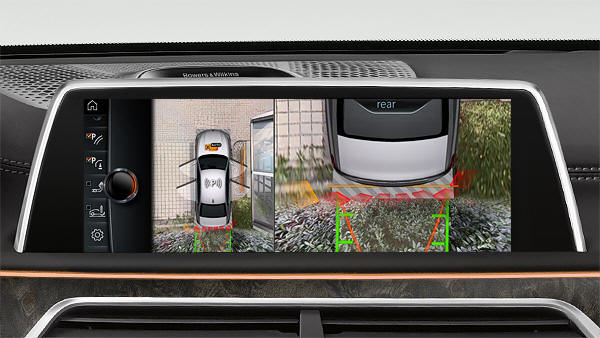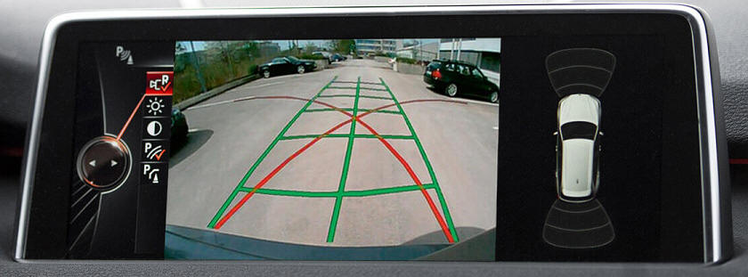 The next three images (from BMW) show the image the driver sees. During parking, the boundaries of the parking space and the objects, such as poles, etc., are clearly visible. During reversing, you can zoom in on the rear; plants are especially visible here. Conventional PDC sensors register the distance to the plants. The computer marks this distance with a red color.
