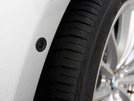When parked backward between two vehicles or large objects, you need to drive slightly forward to look left and right. With a side view camera (also called corner view), this becomes much easier; cameras on the left and right in the front bumper send the image to the display in the dashboard. The image shows the view from the corner cameras. Cameras unfortunately cannot be mounted invisibly. Cars equipped with a side view camera typically have a (usually) black lens in the bumper. The image below shows the front bumper of a BMW with the left camera.